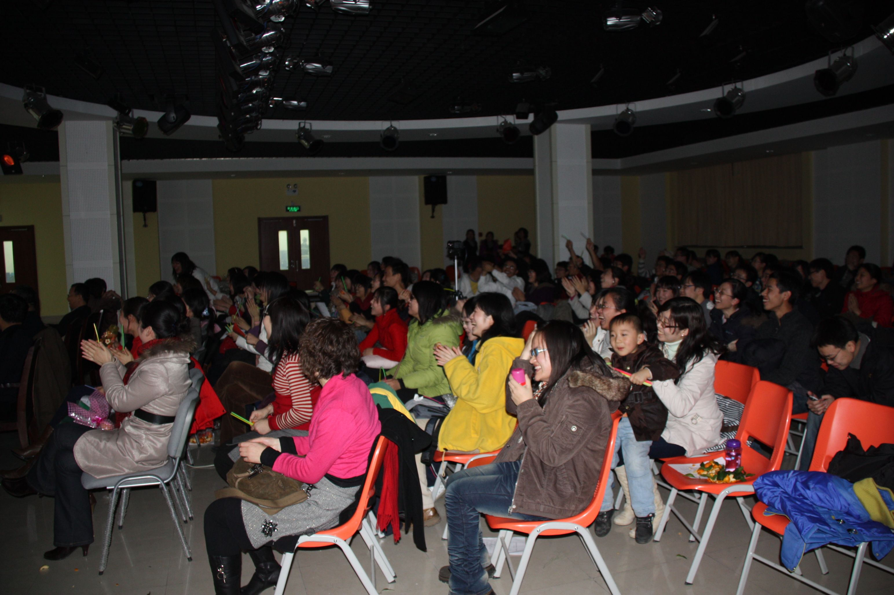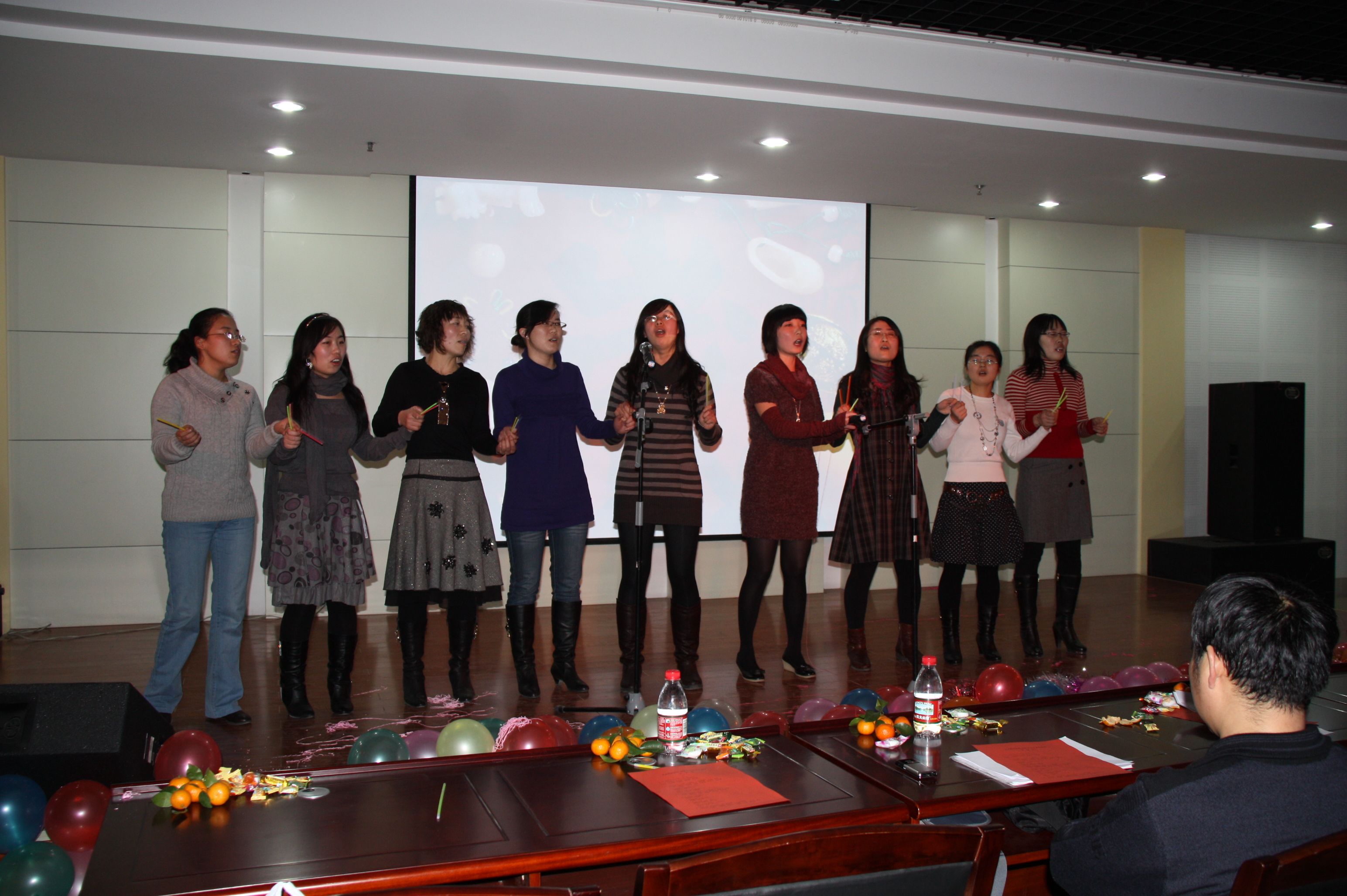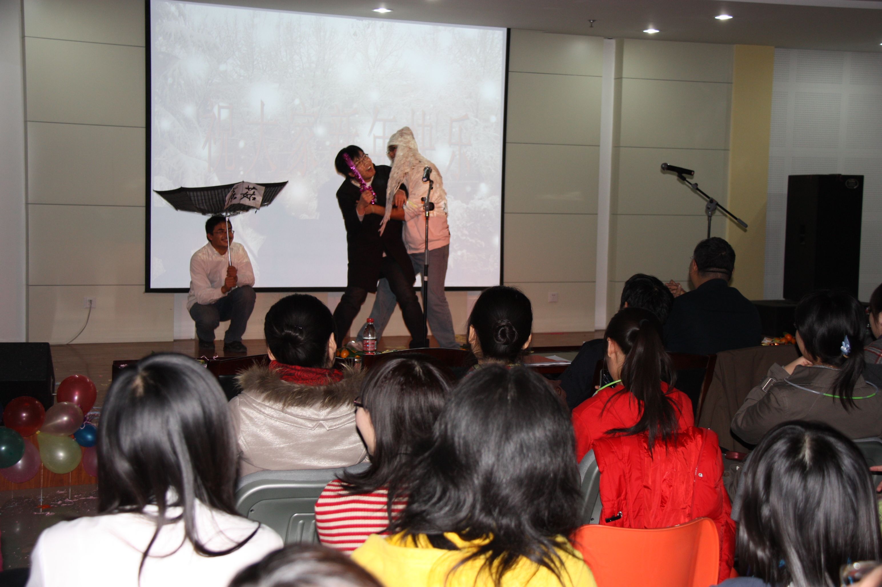 晚会伊始,巴金文书记首先向全体师生致新年贺辞。巴书记回顾了我院在即将过去的一年里所取得的成绩和进步,又充满期待地展望了新的一年学院更加美好的发展前景,让在场的每一位师生倍感自豪,并对未来充满了信心和憧憬,大家都情不自禁地报以热烈的掌声。晚会在08级女生清澈甜美的歌声中正式开始。各个年级的同学你方唱罢我登场,晚会如火如荼地进行着:08级的女生小合唱《一千零一个愿望》,07级的女生二重唱《人间》,09级的京剧联唱《说唱脸谱》,09级的男生合唱加跆拳道表演《男儿当自强》,博士生的男女情歌对唱《月亮代表我的心》,07级、08级的女生歌曲联唱《满天的花、满天的云》、《看海》、《城里的月光》,以及08级、09级的小品剧《荆轲刺秦王》、《白雪公主外传》、《上海滩风云》, 08级的女生相声《关于爱情》,09级的诗歌朗诵《写给母亲的诗》,09级的小提琴伴奏演唱《明月几时有》,09级的女生舞蹈《樱之花》,08级的大合唱《朋友》,还有博士的武术表演……丰富多彩、特色各异的节目轮番登场,让台下的观众时而陶醉,时而捧腹,不时地报以热烈的掌声。尤其是几个小品剧,是全场笑点最多的节目。经过同学们的精心编排,这些充满想象力、极尽搞笑的故事情节再加上同学现场的夸张表演,逗得观众们笑声连连,赢得了阵阵喝彩声。还有两个女生的相声,可谓是巾帼不让须眉,她们把说学逗唱的本事淋漓尽致地展现给观众,带给大家无尽的欢乐。除了同学们的精彩表演之外,老师们的节目也毫不逊色。巴书记的一曲怀旧老歌《在那遥远的地方》让人意犹未尽,又即兴发挥一首《白龙马》赢得满堂喝彩;李鹏程老师和戚良德老师的演唱实力在我院是数一数二的,李老师一曲《长城长》清亮高亢,戚老师一首《儿行千里》深情厚重,而他们强强联手对唱的一首《为了谁》,更是震撼全场;孙剑艺老师诙谐幽默的山东快书《大实话》和国粹京剧《状元谱》的表演,十分特别,让人耳目一新。老师们的表演无疑为已经相当热烈的晚会气氛又添了一把火,一次又一次将晚会推向了高潮。最后,在全体师生齐声高歌《歌唱祖国》的激越旋律中,晚会圆满结束。