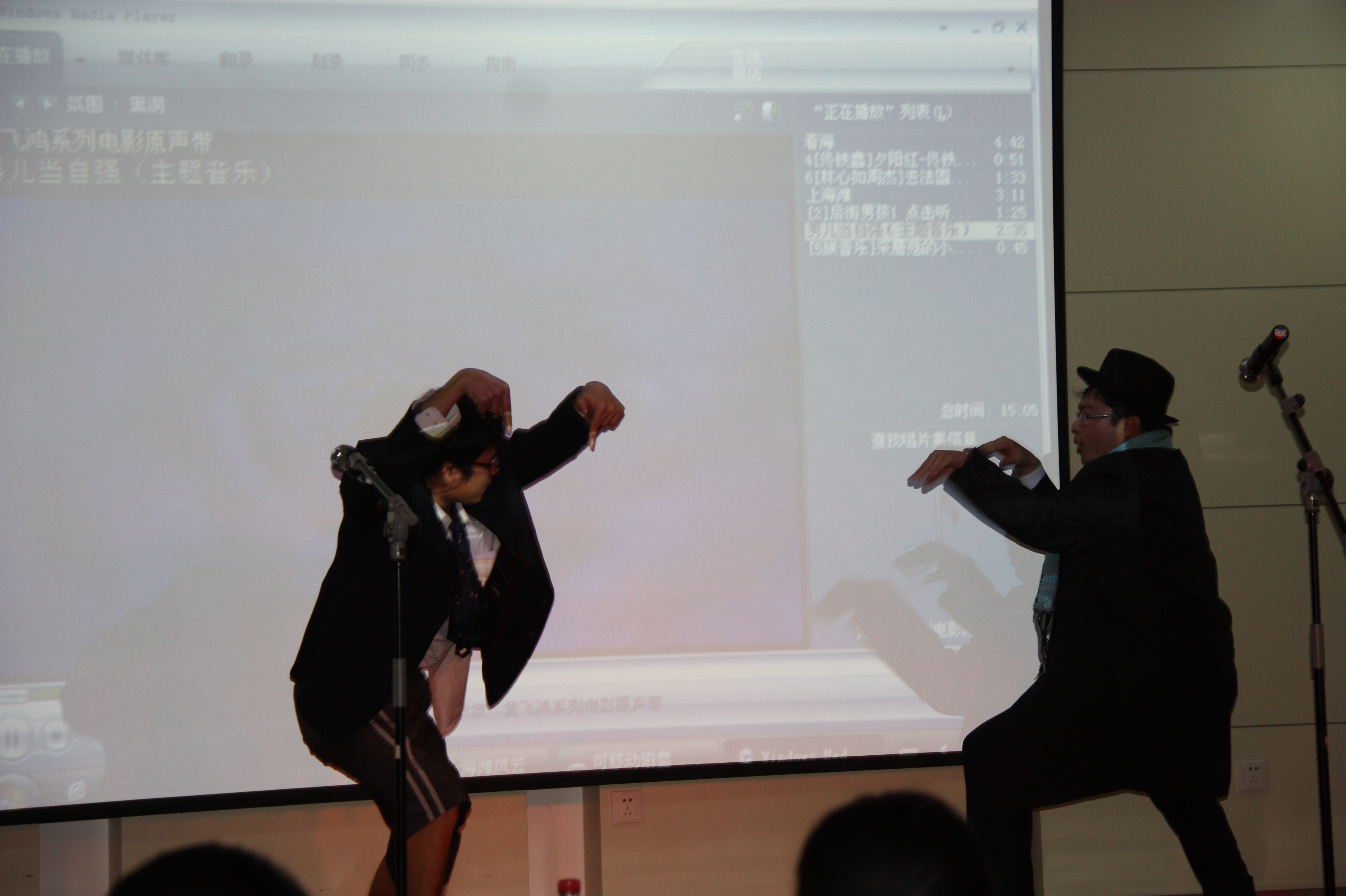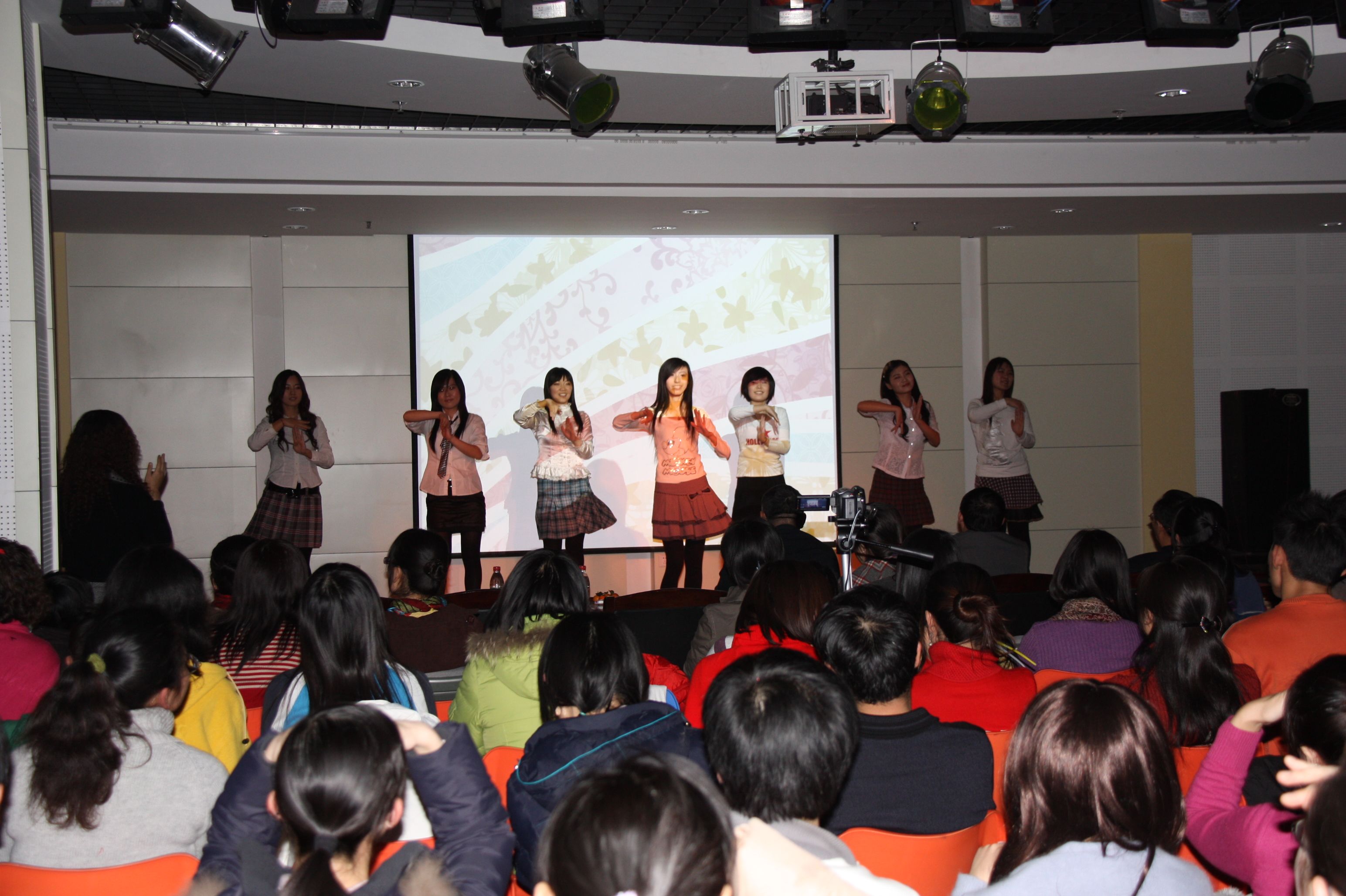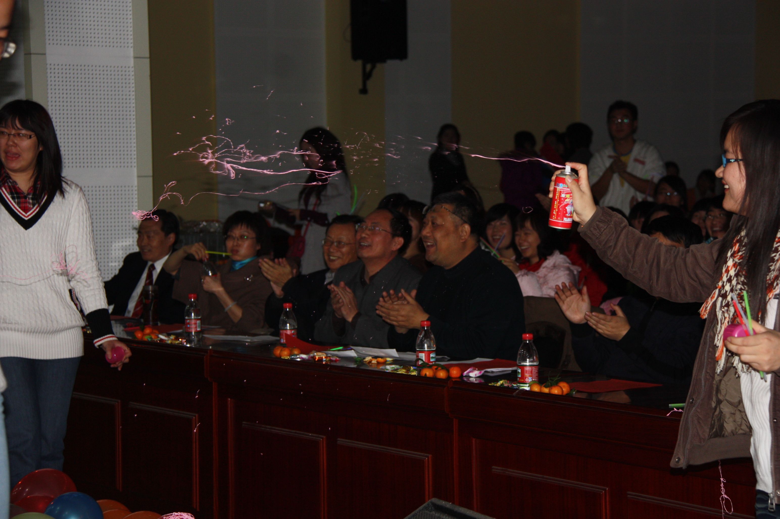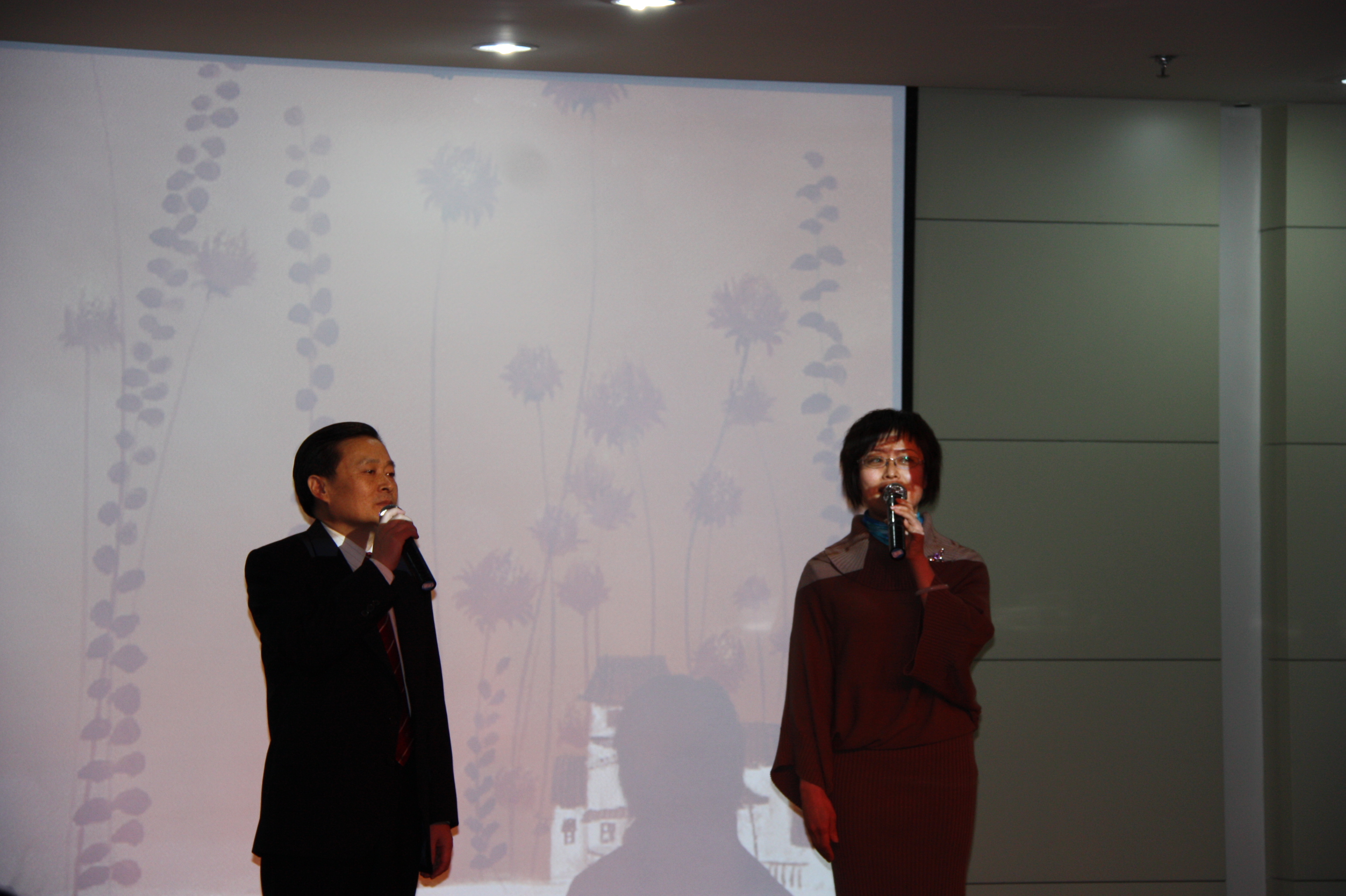 晚会伊始,巴金文书记首先向全体师生致新年贺辞。巴书记回顾了我院在即将过去的一年里所取得的成绩和进步,又充满期待地展望了新的一年学院更加美好的发展前景,让在场的每一位师生倍感自豪,并对未来充满了信心和憧憬,大家都情不自禁地报以热烈的掌声。晚会在08级女生清澈甜美的歌声中正式开始。各个年级的同学你方唱罢我登场,晚会如火如荼地进行着:08级的女生小合唱《一千零一个愿望》,07级的女生二重唱《人间》,09级的京剧联唱《说唱脸谱》,09级的男生合唱加跆拳道表演《男儿当自强》,博士生的男女情歌对唱《月亮代表我的心》,07级、08级的女生歌曲联唱《满天的花、满天的云》、《看海》、《城里的月光》,以及08级、09级的小品剧《荆轲刺秦王》、《白雪公主外传》、《上海滩风云》, 08级的女生相声《关于爱情》,09级的诗歌朗诵《写给母亲的诗》,09级的小提琴伴奏演唱《明月几时有》,09级的女生舞蹈《樱之花》,08级的大合唱《朋友》,还有博士的武术表演……丰富多彩、特色各异的节目轮番登场,让台下的观众时而陶醉,时而捧腹,不时地报以热烈的掌声。尤其是几个小品剧,是全场笑点最多的节目。经过同学们的精心编排,这些充满想象力、极尽搞笑的故事情节再加上同学现场的夸张表演,逗得观众们笑声连连,赢得了阵阵喝彩声。还有两个女生的相声,可谓是巾帼不让须眉,她们把说学逗唱的本事淋漓尽致地展现给观众,带给大家无尽的欢乐。除了同学们的精彩表演之外,老师们的节目也毫不逊色。巴书记的一曲怀旧老歌《在那遥远的地方》让人意犹未尽,又即兴发挥一首《白龙马》赢得满堂喝彩;李鹏程老师和戚良德老师的演唱实力在我院是数一数二的,李老师一曲《长城长》清亮高亢,戚老师一首《儿行千里》深情厚重,而他们强强联手对唱的一首《为了谁》,更是震撼全场;孙剑艺老师诙谐幽默的山东快书《大实话》和国粹京剧《状元谱》的表演,十分特别,让人耳目一新。老师们的表演无疑为已经相当热烈的晚会气氛又添了一把火,一次又一次将晚会推向了高潮。最后,在全体师生齐声高歌《歌唱祖国》的激越旋律中,晚会圆满结束。