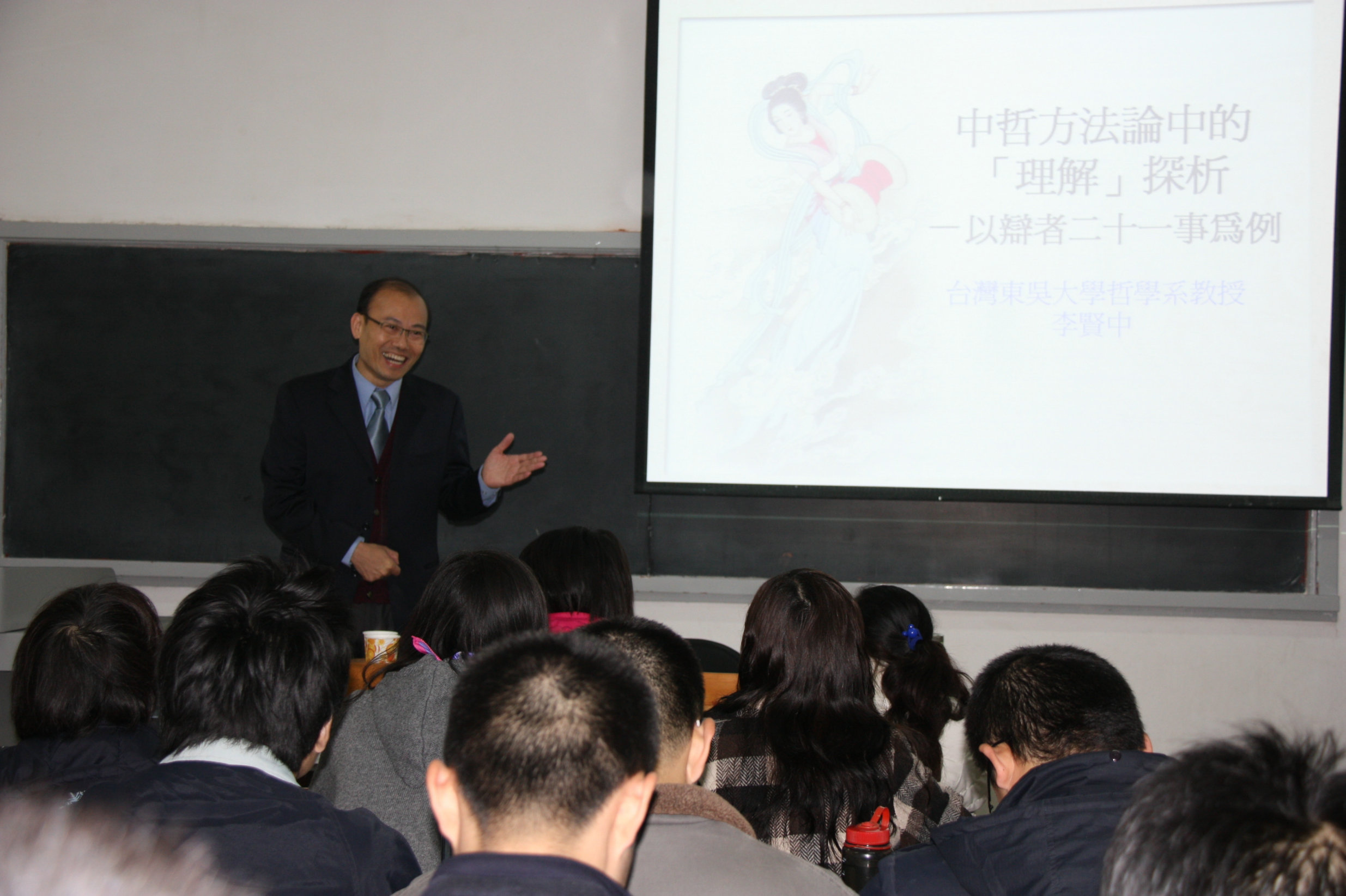 2009年11月27日上午,台湾东吴大学哲学系教授李贤中先生应我院邀请在文史楼336教室作了一场精彩的学术报告。报告会由文史哲研究院副院长李平生教授主持,院长傅永军教授、副院长宋开玉教授、西山尚志讲师以及我院有关专业的博士、硕士研究生参加报告。