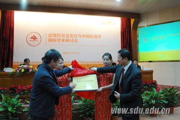 党委副书记方宏建为“中国节日文化研究基地”举行了揭牌仪式。中国民俗学会秘书长叶涛、山东民俗学会会长刘德龙分别对中国民俗学、山东民俗学所取得的成绩给予充分的肯定。文史哲研究院民俗学研究所所长张士闪教授介绍了《节日研究》创刊过程。随后,德国洪堡大学教授卡舒巴(Wolfgang Kaschuba)、中国民俗学会理事长刘魁立先生分别进行大会主题发言。