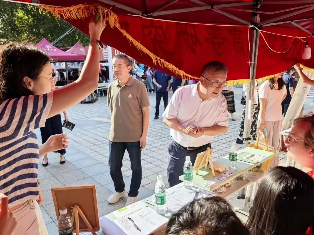 党委书记兼执行院长王加华、党委副书记李鹏程和学院辅导员在报到处迎接新生,确保迎新工作顺利进行。