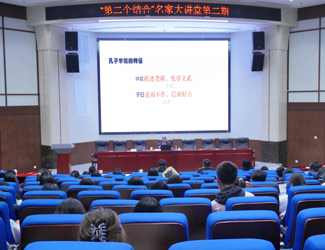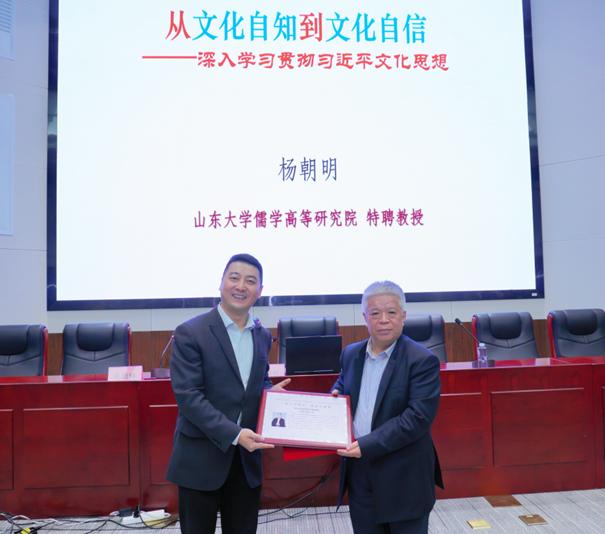 特聘教授杨朝明应邀以“从文化自知到文化自信”为题作报告。中央民族大学协同研究基地副主任兼秘书长、马克思主义学院党委书记兼院长孔新峰教授主持讲座,并为杨朝明教授颁发特聘研究员聘书。校内外百余名师生聆听了本次讲座。
