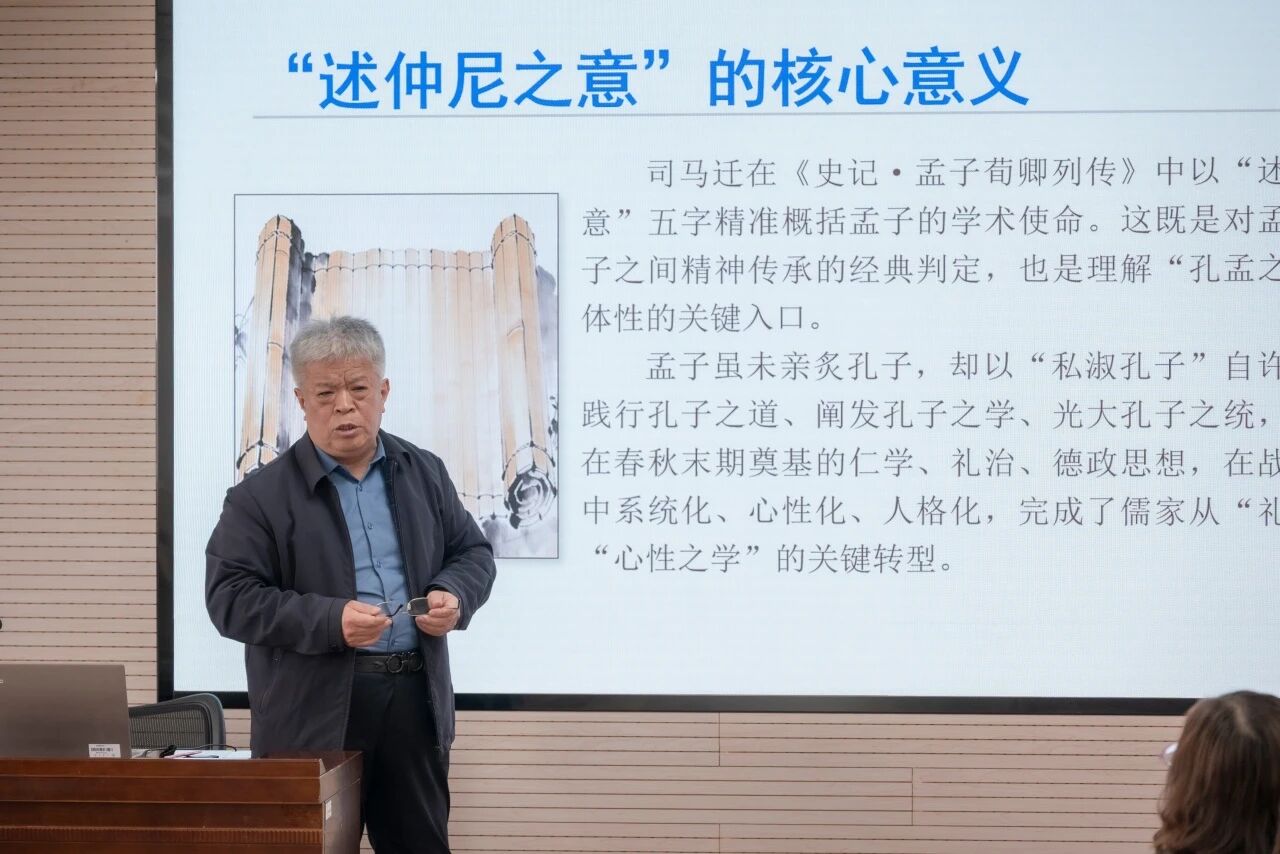 接着,杨朝明教授分析了孟子与孔子人生轨迹的同构性。二人皆生于乱世,幼年失怙、母亲教养,壮年周游列国、力倡仁政,晚年归隐讲学、著书立说。这种生命历程的同构,是“述仲尼之意”的人格基础。在思想内核上,孟子全面继承了孔子的仁学核心、德政理想、修身路径与天人之境,从“为政以德”发展为“仁政”学说,从“修己敬德”发展为“养浩然之气”,从“知天命”发展为“上下与天地同流”。
