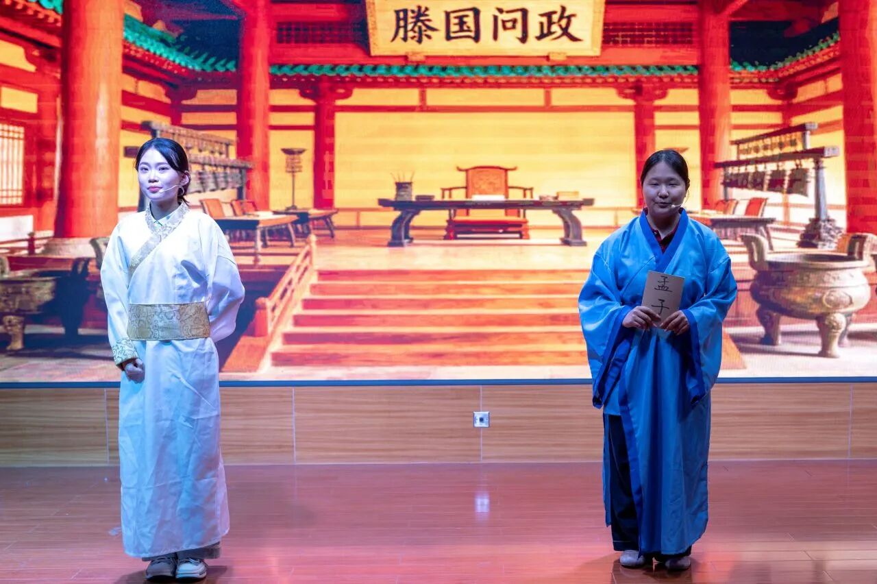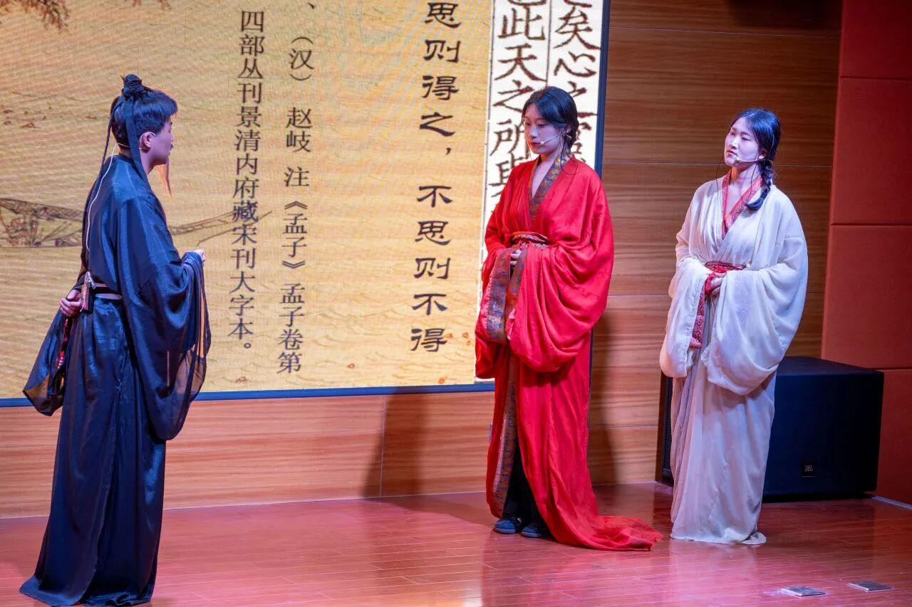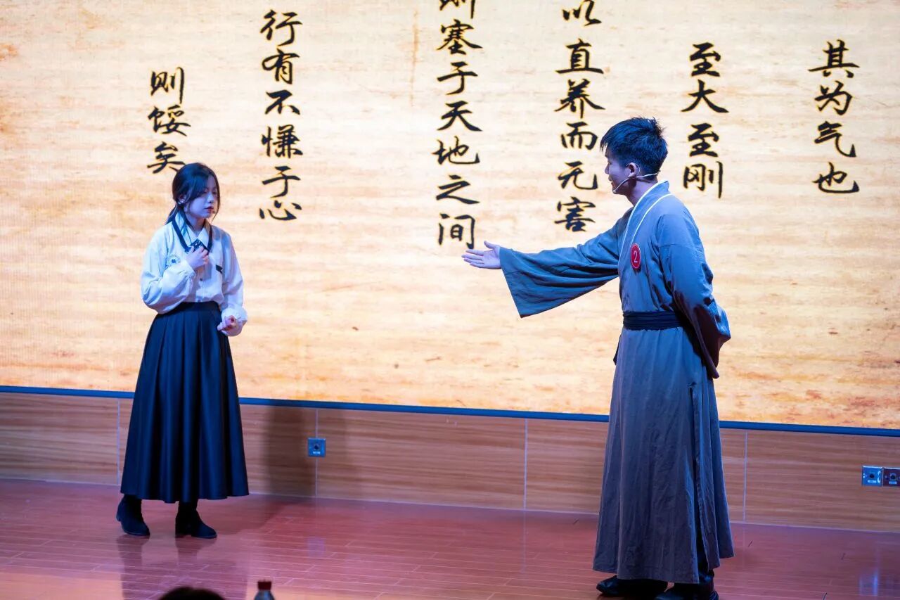 “学无止境,气有浩然”的校训精神深度契合。“典籍故事青年说”第四季《孟子》趣读活动自2026年1月启动,得到全校师生的大力支持。经专家评审,共18组选手脱颖而出,晋级决赛。决赛舞台上,选手们倾情投入,将《孟子》中的经典篇章转化为鲜活的故事演绎,让成人论坛